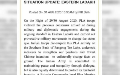 भारत र चिनको विभादित सिमा क्षेत्र लद्दाखमा फेरी दूइ देशका सैनिकबिच झडप भएको छ ।भारतीय सेनाका अनुसार चिनियाँ जनमुक्ति सेनाले दुइ दिन अघि रातको समय पारेर लद्दाखको पूर्वी भागमा पर्ने प्याङगोङ सो ताल क्षेत्रमा पूर्वसहमति भएको सीमा क्षेत्र पार गरेको हो ।आइतबार विज्ञप्ति जारी गर्दै भारतीय सेनाका कर्नेल आमन आनन्दले भनेका छन्,’अगस्ट २९ र ३० को राति चिनियाँ जनमुक्ति सेनाले पहिलाको सहमति अनुसारको यथास्थितिलाई परिवर्तन गर्न सैन्य उक्साहट गरेको थियो। जसलाई भारतीय सेनाले रोकेको छ।’
