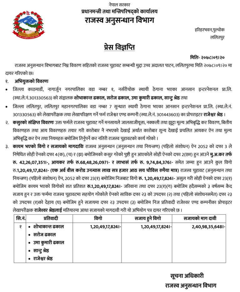 ललिता निवास प्रकरणका अभियुक्त ढकाल दम्पत्तिविरुद्ध १ अर्ब २० करोडको राजश्व छलीको अभियोग