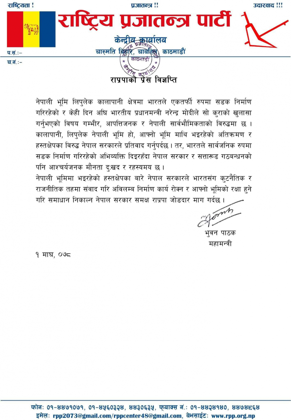 ‘नेपाली भूमि लिपुलेक कालापानी क्षेत्रमा भारतले एकतर्फी रुपमा सडक निर्माण गरिरहेको र केही दिनअघि भारतीय प्रधानमन्त्री नरेन्द्र मोदीले सो कुराको खुलासा गर्नुभएको विषय गम्भीर, आपत्तिजनक र नेपाली सार्वभौमिकताको विरुद्धमा छ,’ राप्रपाका महामन्त्री भुवन पाठकले शनिबार विज्ञप्तिमार्फत् भनेका छन्, ‘कालापानी लिपुलेक नेपाली भूमि हो, आफ्नो भूमिमाथि भइरहेको अतिक्रमण र हस्तक्षेपका विरुद्ध नेपाल सरकारले प्रतिवाद गर्नुपर्दछ ।’