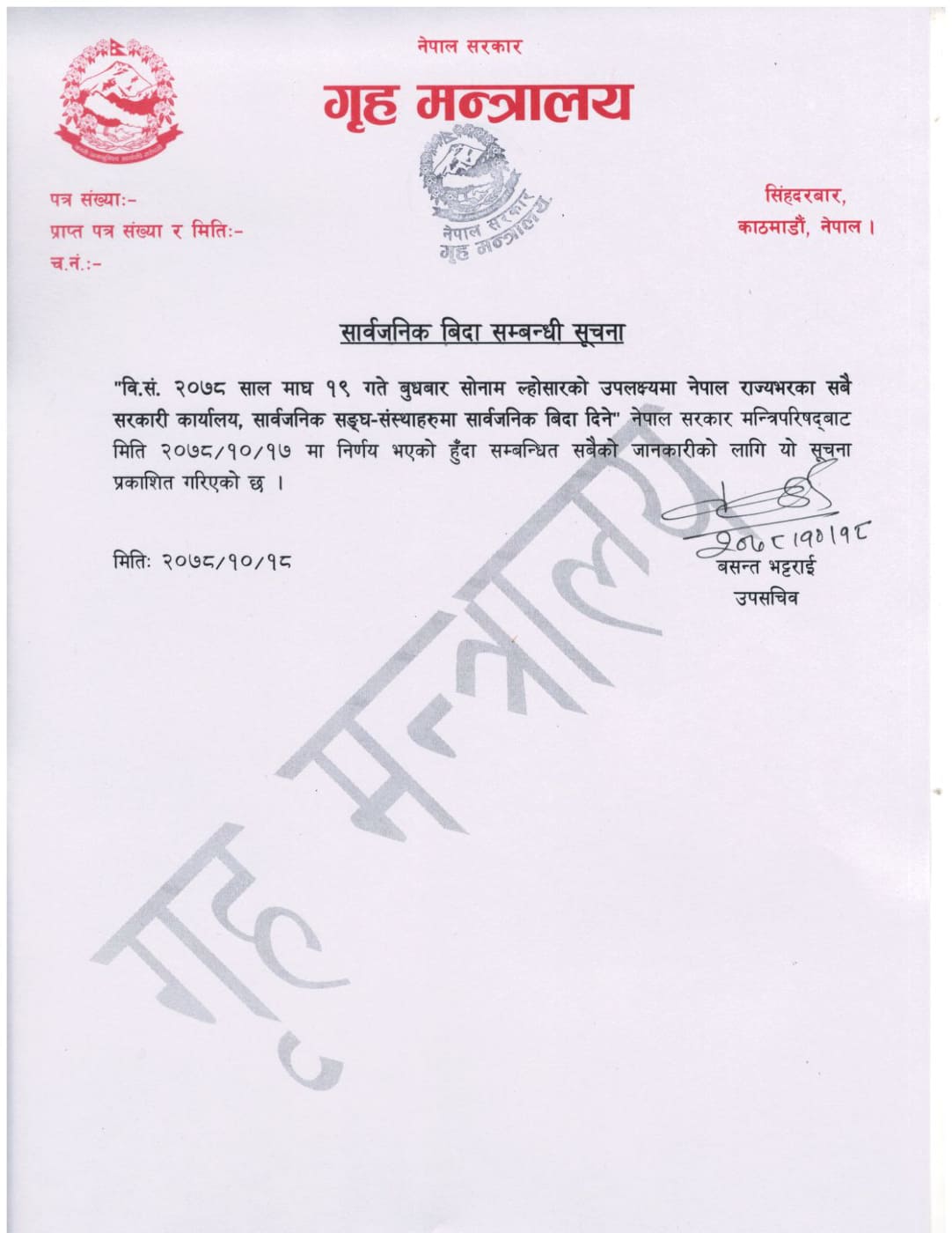 सोमबार बसेको मन्त्रिपरिषद् बैठकले गरेको निर्णयका आधारमा बुधबार सार्वजनिक बिदा दिने सूचना गृह मन्त्रालयले निकालेको हो ।