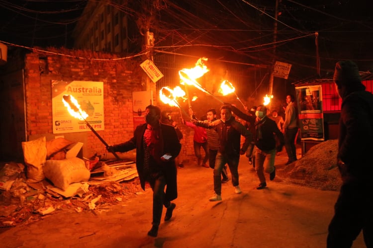 काठमाडौँ , २५ माघ । युवाहरुले एमसीसी विरुद्ध राँके जुलुसको प्रदर्शन गर्दै संसद भवन बानेश्वर चोक अगाडी लगभग ५ मिनेट सम्म युवाहरुले टायर बालेर प्रदर्शन गरेका छन्।
