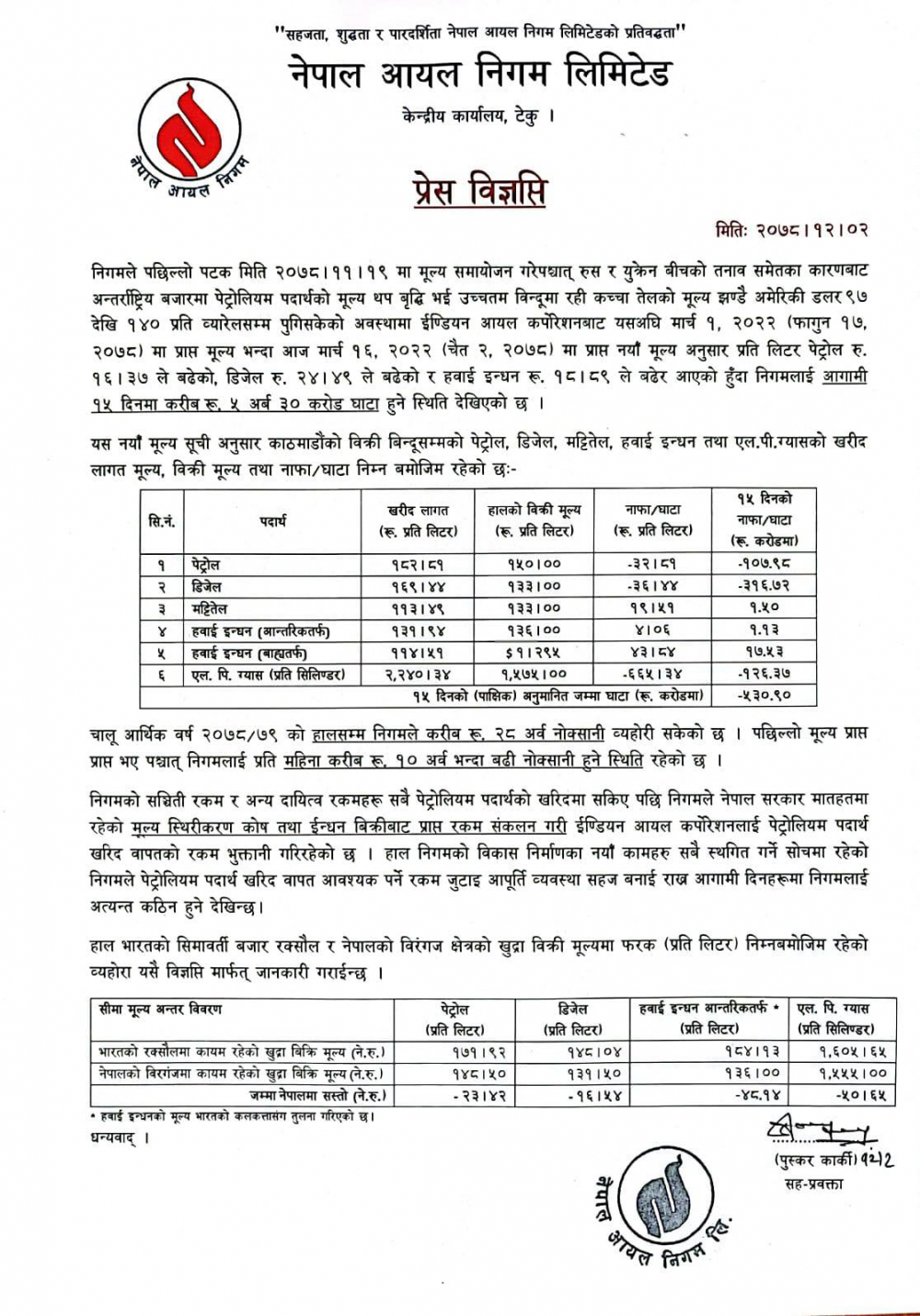 बढेको यो मूल्यअनुसार पाक्षिक नोक्सानी ५ अर्ब ३० करोड पुग्ने निगमले जनाएको छ । यहीं मूल्यअनुसार महिनाको १० अर्ब बढी नोक्सानी पुग्ने निगमले जनाएको छ । निगमका अनुसार अब पेट्रोलमा प्रतिलिटर ३२ रुपैयाँ ८१ पैसा तथा डिजेलमा ३६ रुपैयाँ ४४ पैसा नोक्सानी छ । मट्टितेल र हवाई इन्धनमा भने निगमलाई नाफा छ ।