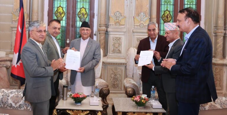 काठमाडौं– प्रधानमन्त्री केपी शर्मा ओली र नेपाली कांग्रेसका सभापति शेरबहादुर देउवालाई सरकारको न्यूनतम साझा कार्यक्रमसम्बन्धी कार्यदलले प्रतिवेदन हस्तान्तरण गरेको छ ।