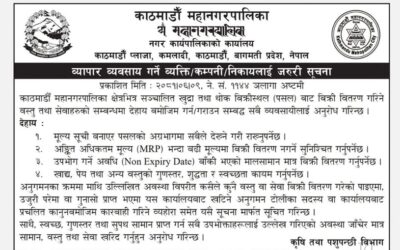 काठमाडौं– काठमाडौं महानगरपालिकाले महानगरभित्रका खुद्रा तथा थोक बिक्रेतालाई ४ बुँदे सूचना जारी गरेको छ। काठमाडौं महानगरका मेयर बालेन शाहले खुद्रा तथा थोक बिक्रेतालाई मूल्य सूची बनाएर पसलको अग्रभागमा सबैले देख्ने गरी राख्न निर्देशन दिएका छन् ।