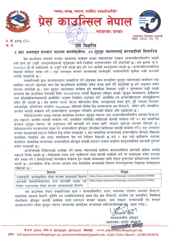 “मिडियाअन्तर्गत आबद्ध नभएका सामाजिक सञ्जाल (युट्युब च्यानल) बाट आचारसंहिताविपरीत अफवाह फैलाउने, द्वन्द्व बढाउने, अश्लील सामग्री सम्प्रेषण गर्ने, अमर्यादित गतिविधि समेटिएको सामग्री सम्प्रेषण गर्ने ४३ वटा सामाजिक सञ्जाल (युट्युब च्यानल)को अनुसन्धान गरी कारबाही गर्न नेपाल प्रहरी ९साइबर ब्युरो०मा पत्राचार गरिएको छ,” विज्ञप्तिमा भनिएको छ ।