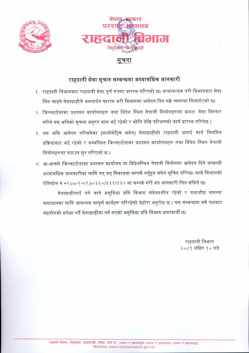 यसअघि आवेदन गरिसकेका अर्थात बायोमेट्रिकसमेत भइसकेका सेवाग्राहीको राहदानी छपाइ नियमित प्रक्रियाबाट भइरहेको र सम्बन्धित जिल्लारइलाका प्रशासन कार्यालय तथा विदेशमा रहेका नेपाली नियोगहरूमा पठाउन शुरू गरेको सूचनामा उल्लेख छ ।