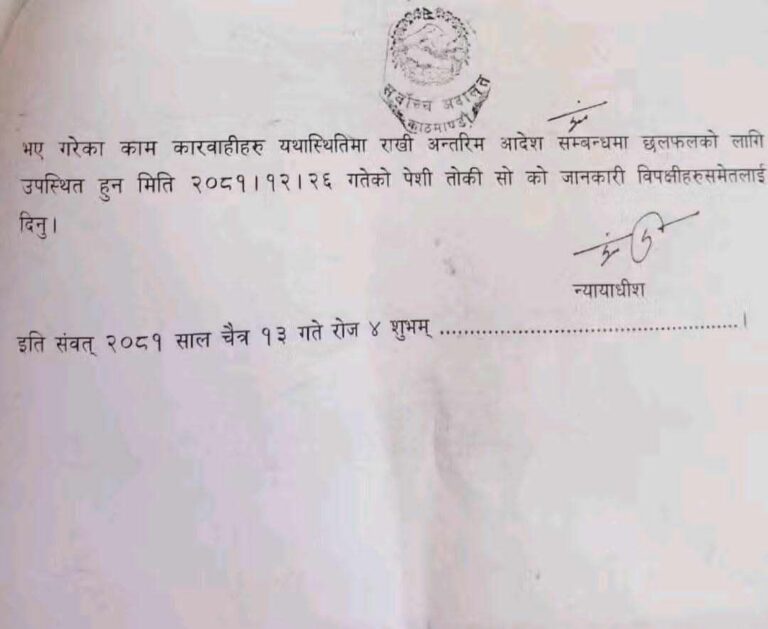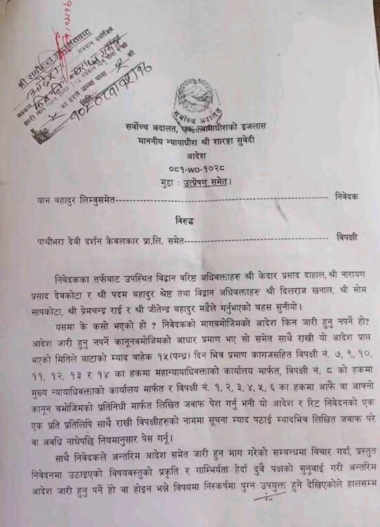 अन्तररिम आदेश जारी गर्ने, नगर्ने सन्दर्भमा छलफल गर्न सर्वोच्च अदालतले चैत २६ गते दुबै पक्षलाई झिकाउने भएको छ । मुकुम्लुङ÷पाथीभरामा उद्योगी ढकालको कम्पनीले केबलकार निर्माण कार्य गरिरहेको छ । स्थानीयवासीले सांस्कृतिक अतिक्रमण भएको भन्दै केबलकारविरुद्ध आन्दोलन गर्दै आएका छन् । शक्तिको आडमा ढकालले प्रसिद्ध तीर्थस्थल पाथीभरामा केवलकार निर्माण गरिरहेका छन् । केवलकार निर्माण रोक्न भन्दै त्यहाँ निरन्तर आन्दोलन भइरहेको छ । तर अहिलेसम्म काम रोकिएको छैन ।