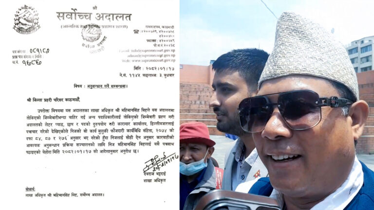 ‘यस अदालतको मुद्दा तथा रिट महाशाखा उल्लेख भई च.नं. १९२७७, मिती २०८२।१। १७ मा कैदमा राख पठाइएको सम्बन्धमा भन्ने विषयमा श्री कारागार कार्यालय डिल्लीबजारका नाममा लेखिएको पत्र यस अदालतको आधिकारिक पत्र नभएको हुँदा उक्त पत्र कार्यान्वयन नगरी उक्त पत्रबमोजिम कैलाली जिल्ला साविक दुर्गौली गा.वि.स. वडा नं. ८ हाल जानकी गाँउपालिका वडा नं ६ घर भएका लालविर चौधरीको छोरा रेशमलाल चौधरी पक्राउ परेको भए तत्काल कैद र थुनामुक्त गरिदिनुहुन अनुरोध छ,’ सहरजिष्ट्रार अच्युत कुइँकेलले लेखेको पत्रमा भनिएको छ ।