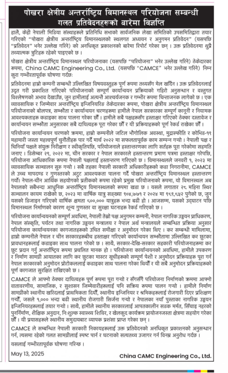 काठमाडौं । पोखरा क्षेत्रीय अन्तर्राष्ट्रिय विमानस्थलसम्बन्धी लेखा समितिको प्रतिवेदनलाई लिएर चाइना सीएएमसी इन्जिनियरिङ कम्पनी लिमिटेडले आक्रोश व्यक्त गरेको छ । परियोजनाको ठेकेदार कम्पनी सीएएमसीले आफूमाथि गरिएको टिप्पणीलाई त्रुटिपूर्ण, तथ्यहीन, हचुवा र पूर्वाग्रही भन्दै आपत्ति जनाएको छ ।