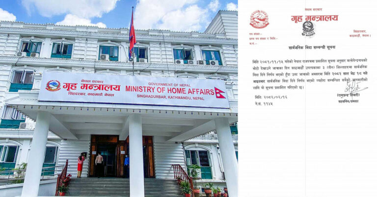 काठमाडौं – सरकारले आइतबार काठमाडौं उपत्यकामा सार्वजनिक बिदा दिने निर्णय गरेको छ । गृह मन्त्रालयले शुक्रबार विज्ञप्ति जारी गर्दै आइतबार सार्वजनिक बिदा दिने निर्णय भएको उल्लेख गरेको छ ।