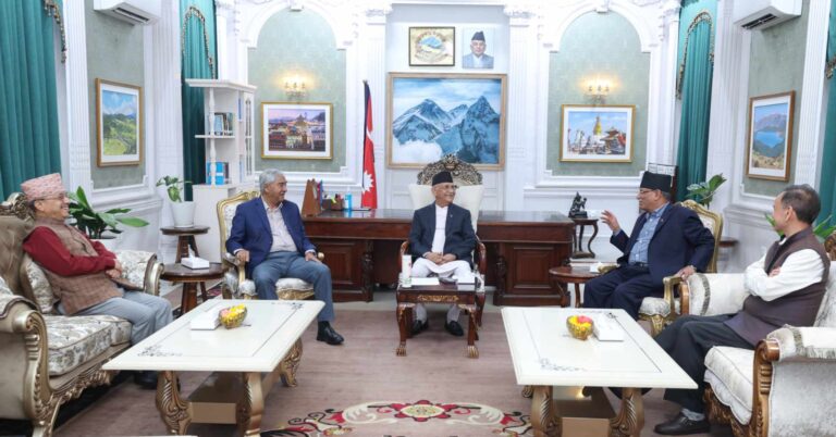 काठमाडौं — सिंहदरबारमा बसेको शीर्ष तीन दलका नेताहरूको बैठकमा प्रमुख प्रतिपक्षी दल नेकपा माओवादी केन्द्रले गृहमन्त्री रमेश लेखकको राजीनामाको माग दोहोर्याएको छ।