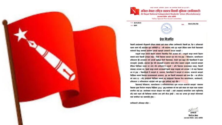 काठमाडौं, जेठ २४ – अखिल नेपाल राष्ट्रिय स्वतन्त्र विद्यार्थी यूनियन (क्रान्तिकारी), उपत्यका विशेष प्रदेश समितिले निजी विद्यालयहरूमा बढ्दो शुल्क, मनोमानी, व्यापारीकरण तथा शिक्षा क्षेत्रमा व्याप्त देखापरेका विसंगति विरुद्ध विरोध जनाएको छ। हालैको शैक्षिक सत्र सुरु हुँदै गर्दा निजी विद्यालयहरूले मनपरी शुल्क संकलन गर्न थालेको भन्दै समितिले कडा चेतावनीसहित प्रेस विज्ञप्ति सार्वजनिक गरेको हो।