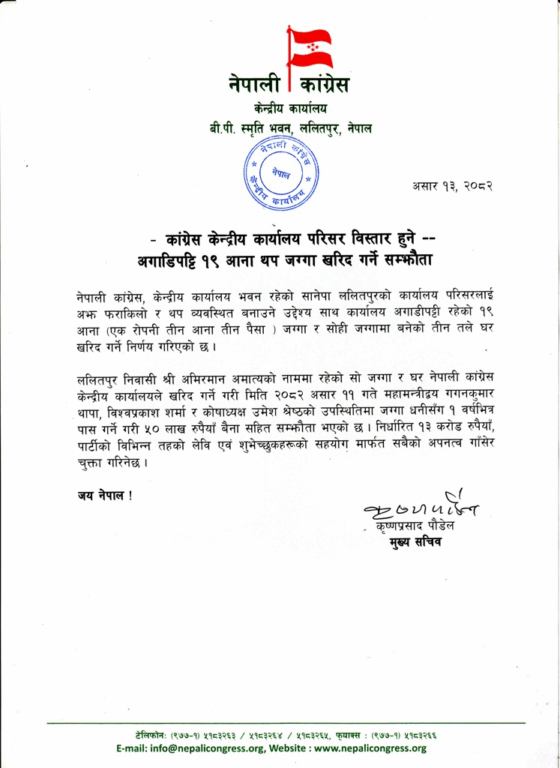 महामन्त्रीद्वय गगन थापा, विश्वप्रकाश शर्मा र कोषाध्यक्ष उमेश श्रेष्ठको उपस्थितिमा जग्गा धनीसँग सम्झौता भएको हो । घर जग्गा खरिदका लागि १३ करोड रुपैयाँ, पार्टीको विभिन्न तहको लेभी एवं शुभेच्छुकहरूको सहयोगमार्फत उठाइने पनि कांग्रेसले जनाएको छ ।