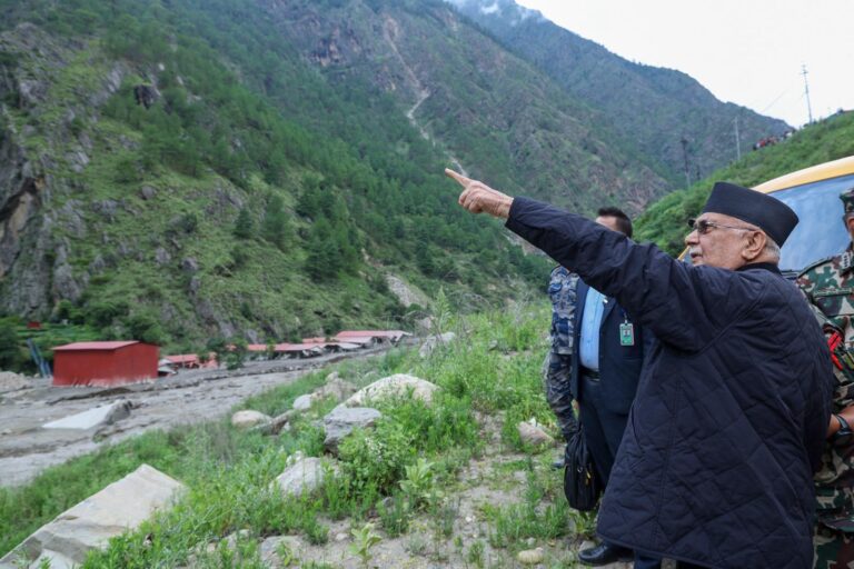 काठमान्डौ- प्रधानमन्त्री केपी शर्मा ओलीले सोमबार राति भोटेकोसी नदीमा आएको भीषण बाढीका कारण भएको धनजनको क्षतिको स्थलगत अवलोकन गरेका छन्। बाढी प्रभावित क्षेत्र निरीक्षणका क्रममा उनले स्थानीय प्रशासन, जनप्रतिनिधि तथा पीडितहरूसँग प्रत्यक्ष संवाद गर्दै उद्धार र राहतको अवस्थाबारे जानकारी लिएका हुन्।
