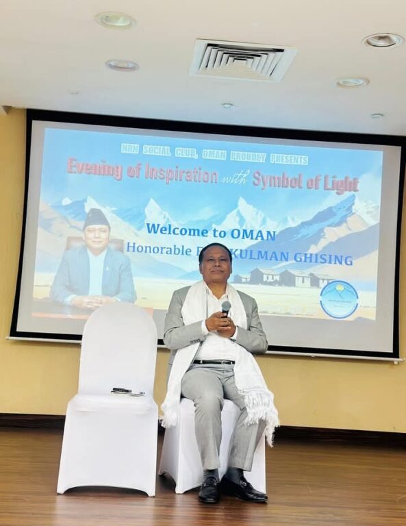 मस्कट, ओमान | नेपाल विद्युत प्राधिकरणका पूर्व कार्यकारी निर्देशक तथा ऊर्जा क्षेत्रका प्रेरणादायी व्यक्तित्व कुलमान घिसिङलाई ओमानमा बृहत् नागरिक अभिनन्दन गरिएको छ। नेपाली दूतावासको समन्वयमा आयोजित विशेष कार्यक्रममा ओमानस्थित नेपाली समुदाय, व्यवसायी, अभियन्ता र विभिन्न संघसंस्थाहरूले घिसिङलाई “प्रकाशको प्रतीक” का रूपमा सम्मान गर्दै “प्रेरणाको प्रकाश” प्रदान गरेका थिए।