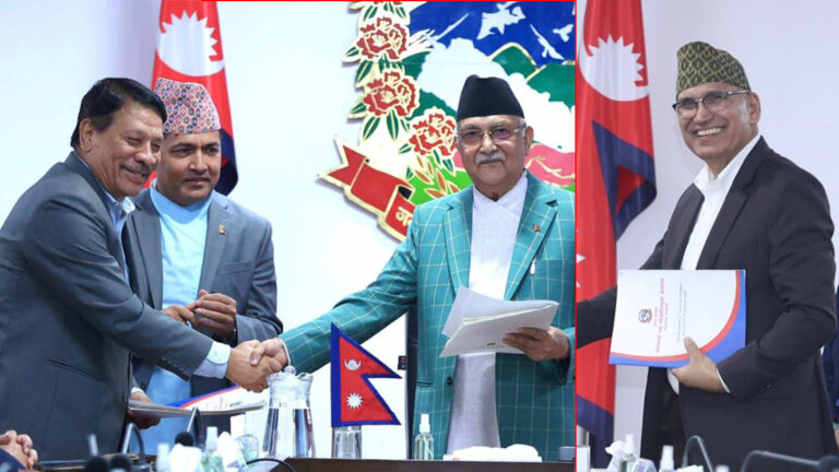 काठमाडौं । प्रधानमन्त्री केपी ओलीसँग दुई उपप्रधानमन्त्रीसहित सबै मन्त्रीले कार्यसम्पादन सम्झौता गरेका छन् । बिहीबार सिंहदरबारस्थित प्रधानमन्त्री तथा मन्त्रिपरिषद्को कार्यालयमा आयोजित कार्यक्रममा एक वर्षका लागि कार्यसम्पादन सम्झौता भएको हो । मन्त्रीहरूले अबको एक वर्षमा आफूलाई प्रधानमन्त्री कार्यालयले दिएको कामको रिपोर्ट कार्ड पेस गर्नुपर्ने छ । कार्यसम्पादन सम्झौता गर्नेमा उपप्रधानमन्त्रीद्वय प्रकाशमान सिंह र विष्णु पौडेल पनि छन् ।