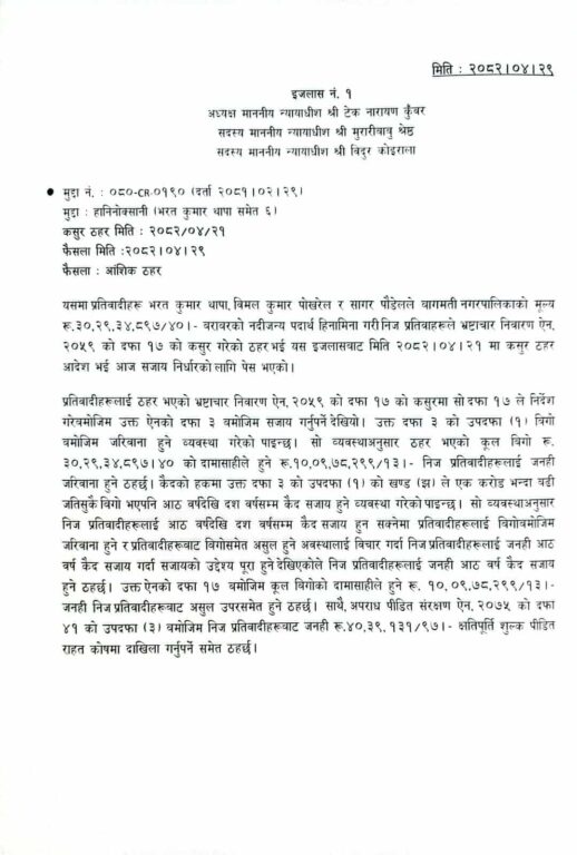विशेषका अध्यक्ष टेकनारायण कुँवर, मुरारीबाबु श्रेष्ठ र विदुर कोइरालाको बिहीबारको इजलासले मेयर थापासहित विमल कुमार पोखरेल र सागर पौडेललाई जनही आठ वर्ष कैद र १० करोड नौ लाख ७८ हजार २९९ रुपैयाँ जरिवाना तोकेको हो। पोखरेल तत्कालीन प्रमुख प्रशासकीय अधिकृत हुन् भने पौडेल नगरपालिकाका योजना शाखा प्रमुख तथा इन्जिनियर हुन्।