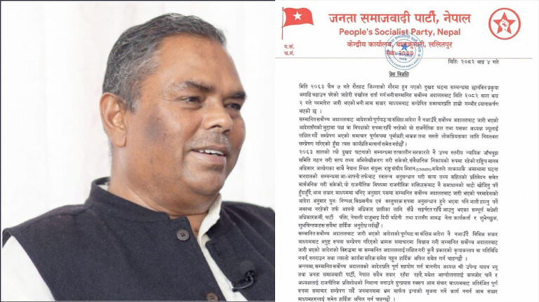 ‘सर्वोच्च अदालतबाट आदेशको पूर्णपाठ वा संक्षिप्त आदेश नै नआउँदै, सर्वोच्च अदालतबाट जारी भएको आदेशसँगको मुद्दामा पक्ष वा विपक्षको रुपमा रहँदै नरहेको यो राजनैतिक दल तथा यसका अध्यक्ष ज्यूलाई लक्षित गर्दै सम्प्रेषण भएको समाचार पूर्णरुपमा पूर्वाग्रही, भ्रामक तथा सस्तो लोकप्रियताका लागि नियतवश सम्प्रेषण गरिएको हुँदा त्यस कार्यप्रति भत्सर्नासमेत गर्दछौँ,’ जसपा नेपालका महासचिव मनिषकुमार सुमनले जारी गरेको विज्ञप्तिमा छ ।