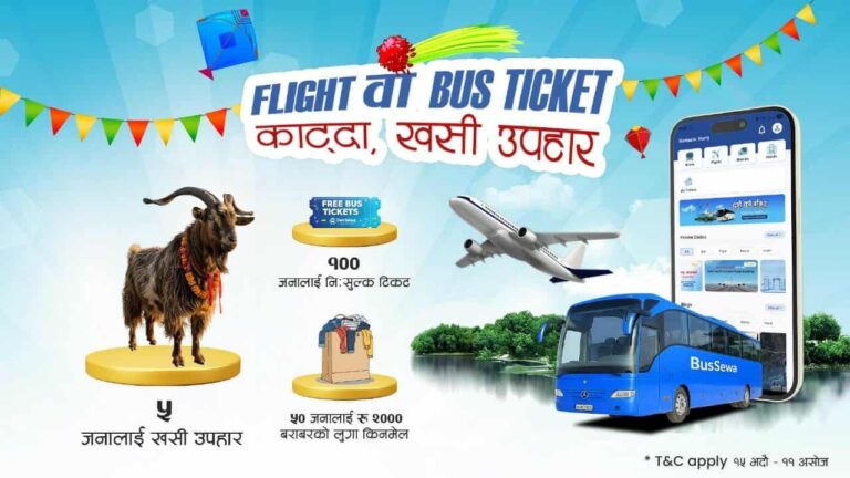 हवाई सेवा पुगेका सबै जिल्लाका उडानका लागि टिकट उपलब्ध रहेको जनाइएको छ । बससेवाबाट टिकट काट्नेमध्ये सयजनालाई फ्रि टिकट १५ भदौदेखि ११ असोजसम्म मोबाइल एप (बससेवा) र वेबसाइट (बससेवाडटकम) मार्फत टिकट काट्ने यात्रुहरुलाई बस सेवाले विभिन्न उपहारको समेत व्यवस्था गरेको छ । यस अवधिमा टिकट काट्ने यात्रुहरुमध्ये एक सयजनालाई निःशुल्क टिकटको व्यवस्था, पाँचजनालाई खसी उपहार र ५० जनालाई दुई हजार रुपैयाँ बराबरको लुगा किनमेल समेत गर्न सक्ने व्यवस्था गरेको छ ।