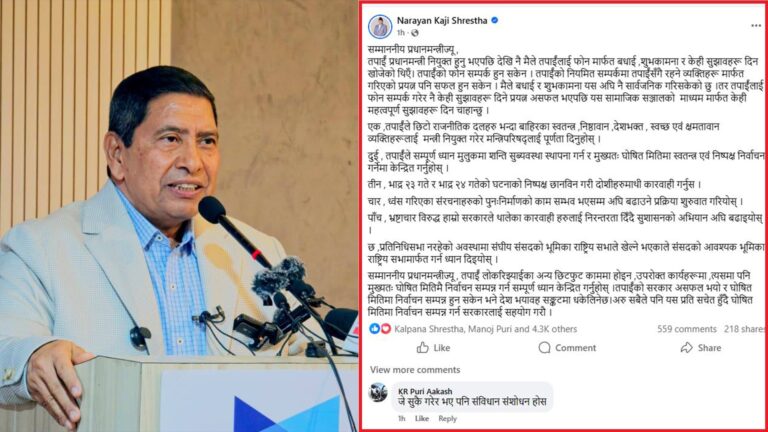 काठमाडौं – माओवादी उपाध्यक्ष नारायणकाजी श्रेष्ठले प्रधानमन्त्री सुशीला कार्कीलाई ६ बुँदे सुझाव दिएका छन् । आफूले फोनमार्फत बधाई र केही सुझाव दिन खोजे पनि त्यो प्रयत्न असफल भएकाले सामाजिक सञ्जालमार्फत सुझाव दिनुपरेको बताएका छन् ।