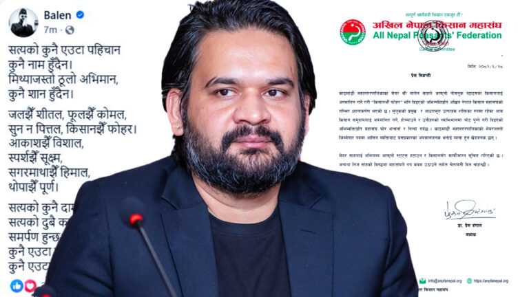 यस्तो अभिव्यक्ति किसान मात्र होइन, सम्पूर्ण श्रमजीवी वर्गमाथि प्रहार हो,’ महासंघका अध्यक्ष डा. प्रेम दंगालले हस्ताक्षर गरेको विज्ञप्तिमा उल्लेख छ । महासंघले बालेन साहजस्तो जिम्मेवार पदमा रहेका व्यक्तिबाट यस्तो गैरजिम्मेवार र विभाजनकारी टिप्पणी आउनु दुःखद भएको जनाएको छ ।