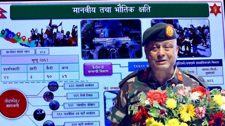 काठमाडौं । नेपाली सेनाले भदौ २३ र २४ मा भएको जेनजी आन्दोलनमा मृत्यु भएकामध्ये २२ जना मात्रै जेनजी प्रदर्शनकारी भएको बताएको छ । सेनाले शुक्रबार पत्रकार सम्मेलनको अयोजना गरी यस्तो तथ्य सार्वजनिक गरेको हो । सेनाले आयोजना गरेको पत्रकार सम्मेलनमा सेनाका युद्धकार्य विभागका प्रमुख उपरथी अनुपजंग थापाले आन्दोलनमा मृत्यु भएकामध्ये २२ प्रदर्शनकारीको ज्यान गएको बताए।