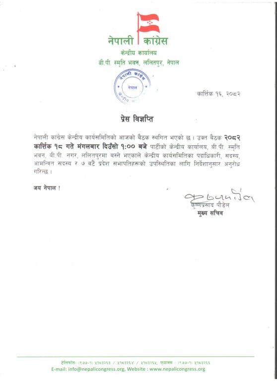 काठमाडौं । महाधिवेशनमा सहमति नजुटेपछि नेपाली कांग्रेस केन्द्रीय समिति बैठक फेरि स्थगित भएको छ । मुख्यसचिव कृष्णप्रसाद पौडेलले आइतबार विज्ञप्ति जारी गर्दै मंगलबार दिउँसो १ बजेसम्मका लागि स्थगित भएको जानकारी गराएका छन् ।