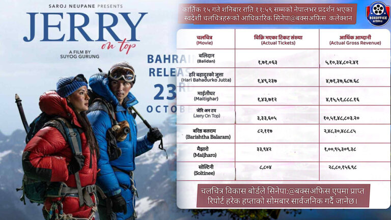 काठमाडौं । चलचित्र विकास बोर्डले दसैंयता प्रदर्शनमा आएका सात चलचित्रको व्यापारको विवरण सार्वजनिक गरेको छ । हरेक सोमबार बोर्डले बक्स अफिस रिपोर्ट प्रकाशन गर्ने गर्छ । जसअनुसार सोमबार प्रकाशित बक्स अफिस रिपोर्टमा अनमोल केसी स्टारर ‘जेरी अन टप’ अगाडि छ ।