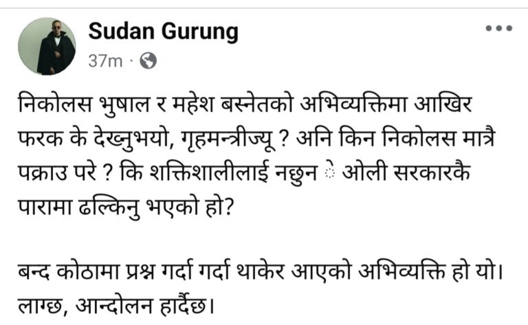 ‘निकोलस भुसाल र महेश बस्नेतको अभिव्यक्तिमा आखिर फरक के देख्नुभयो, गृहमन्त्रीज्यू ? अनि किन निकोलस मात्रै पक्राउ परे ? कि शक्तिशालीलाई नछुने ओली सरकारकै पारामा ढल्किनु भएको हो ?’ उनले प्रश्न गर्दै भनेका छन् ।