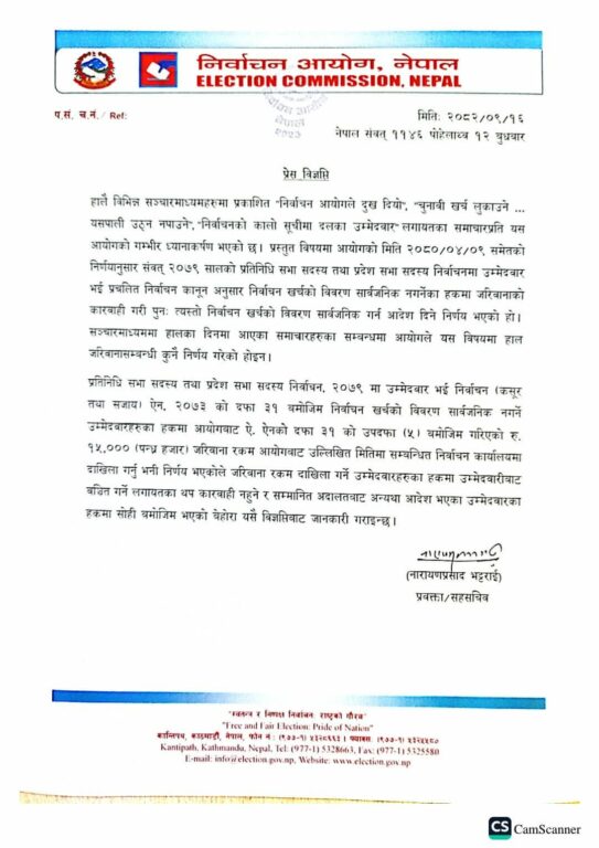 ‘हालै विभिन्न सञ्चारमाध्यमहरुमा प्रकाशित निर्वाचन आयोगले दुख दियो, चुनावी खर्च लुकाउने, यसपाली उठ्न नपाउने, निर्वाचनको कालोसूचीमा दलका उम्मेदवारलगायतका समाचारप्रति यस आयोगको गम्भीर ध्यानाकर्षण भएको छ। प्रस्तुत विषयमा आयोगको मिति २०८० साउन ९ समेतको निर्णयानुसार संवत् २०७९ सालको प्रतिनिधि सभा सदस्य तथा प्रदेश सभा सदस्य निर्वाचनमा उम्मेदवार भई प्रचलित निर्वाचन कानूनअनुसार निर्वाचन खर्चको विवरण सार्वजनिक नगर्नेका हकमा जरिवानाको कारबाही गरी पुनः त्यस्तो निर्वाचन खर्चको विवरण सार्वजनिक गर्न आदेश दिने निर्णय भएको हो। सञ्चारमाध्यममा हालका दिनमा आएका समाचारहरुका सम्वन्धमा आयोगले यस विषयमा हाल जरिवानासम्बन्धी कुनै निर्णय गरेको होइन,’ आयोगले भनेको छ ।