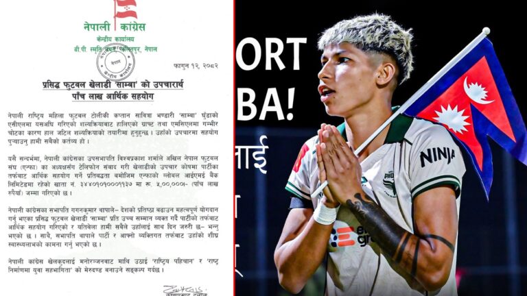 काठमाडौं – नेपाली कांग्रेसले राष्ट्रिय महिला फुटबल टोलीकी कप्तान सावित्रा भण्डारी साम्बाको घुँडाको उपचारका लागि पाँच लाख रुपैयाँ सहयोग गरेको छ ।