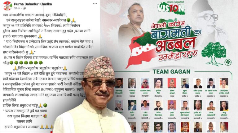 काठमाडौं – नेपाली कांग्रेसका निवर्तमान कार्यवाहक सभापति पूर्णबहादुर खड्काले फागुन २१ गते हुने प्रतिनिधिसभा निर्वाचनमा भाग लिन र कांग्रेसलाई जिताउन अपिल गरेका छन् ।