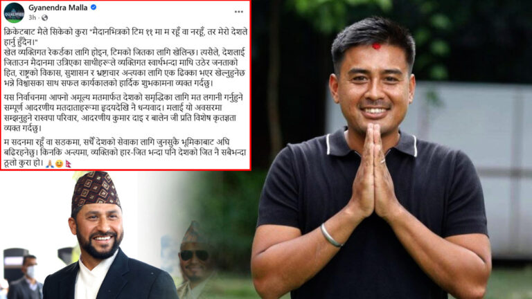 राष्ट्रिय टोलीको कप्तान भइसकेका मल्लले समानुपातिकतर्फ रास्वपाको बन्दसूचीबाट सांसद बनेकाहरूलाई बधाई दिँदै लेखेका छन्, ‘म सदनमा रहुँ वा सडकमा, सधैँ देशको सेवाका लागि जुनसुकै भूमिकाबाट अघि बढिरहनेछु । किनकि अन्त्यमा, व्यक्तिको हार(जितभन्दा पनि देशको जित नै सबैभन्दा ठूलो कुरा हो ।’