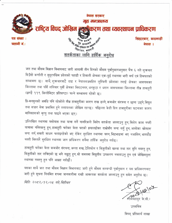 यसबाहेक तराई र पहाडी क्षेत्रमा शुक्रबार र शनिबार हावाहुरीसँगै पानी पर्ने आकलन गरिएकोे छ। बिहीबार साँझ पश्चिम नेपाल भएर भित्रिने न्यून चापीय प्रणाली पश्चिमी वायु र स्थानीय वायुमा मिसिएर बलियो बनिरहेको हो। जसले वर्षा, हावाहुरी, चट्याङको जोखिम बढाएको छ। ‘उल्लिखित स्थानमा बसोबास तथा यात्रा गर्ने नागरिकले विशेष सतर्कता अपनाउनु हुन, विशेष काम नपरी यात्रामा ननिस्कनु हुन, हावाहुरी चलेका बेला घरको झ्यालढोका राम्रोसँग बन्द गर्नु हुन, आगोका स्रोतहरु बन्द गर्न, सवारी साधन चलाइरहेको भए रोकेर सुरक्षित स्थानमा बस्न, भिडभाडमा भए नआत्तिन, भागदौड नगरी बिस्तारै सुरक्षित स्थानमा जान प्राधिकरण सबैमा हार्दिक अनुरोध गर्दछ,’ विभागले जारी गरेको सूचनामा भनिएको छ ।