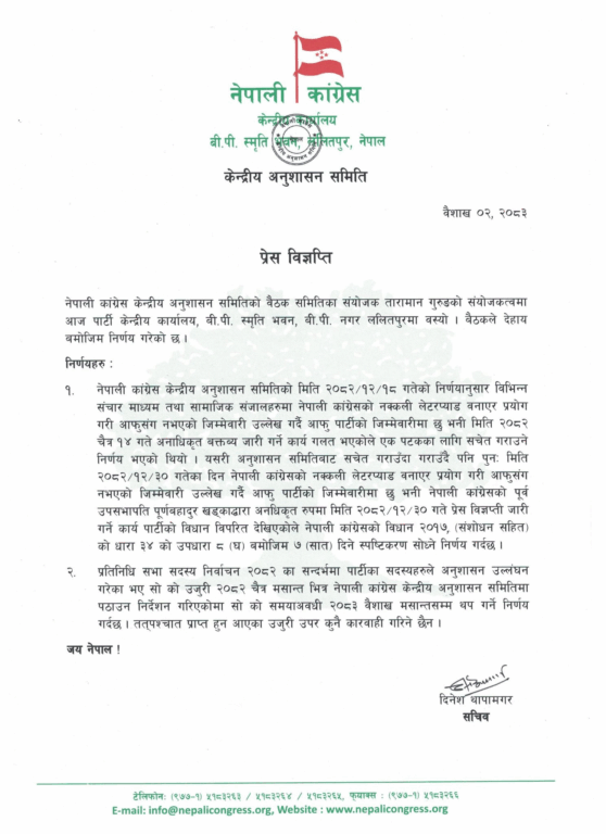 आफूले नपाएको पद र लेटरप्याडको दुरुपयोग गरेको ठहर गर्दै सात दिनभित्र स्पष्टीकरण पेस गर्न भनिएको छ । बैठकले प्रतिनिधिसभा सदस्य निर्वाचनका सन्दर्भमा नेता कार्यकर्ताले अनुशासन उल्लंघन गरेको भए उजुरी दिन चैत मसान्तसम्म म्याद तोकिएकामा त्यसलाई बढाएर वैशाख मसान्तसम्म पुर्याइएको छ । त्यसपछि आएका उजुरीबारे कुनै कारबाही प्रक्रिया अघि नबढाइने गुरुङले बताए ।