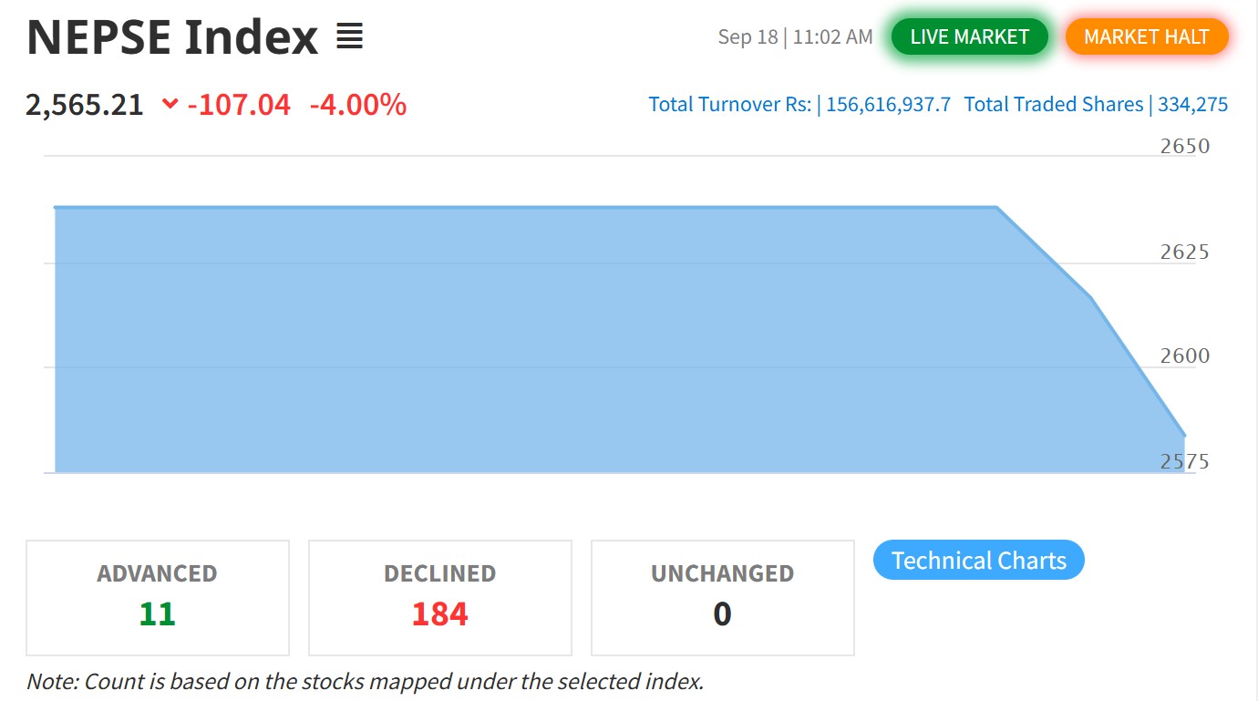 काठमाडौं । जेनजी आन्दोलनले स्थगित रहेर बिहीबार खुलेको सेयर बजार झन्डै डेढ सय अंकले ओरालो लागेपछि कारोबार स्थगित गरिएको छ । कारोबार सुरु भएको केही बेरमै ४ प्रतिशतले इन्डेक्स ओरालो लागेपछि ‘मार्केट हल्ट’ गर्नुपरेको छ। सामान्यतया कुनै निश्चित समयावधिभित्र सूचकांक धेरै माथि वा तल जाँदा (जस्तै, ४ प्रतिशतभन्दा बढी उतारचढाव हुँदा) बजारलाई स्थिर पार्न नेप्सेले…