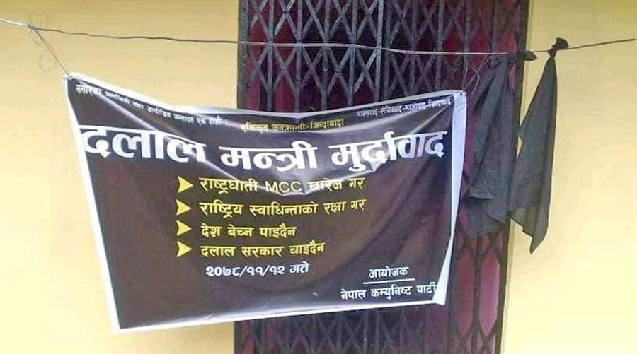 विप्लव नेतृत्वको नेपाल कम्युनिष्ट पार्टीले कानून, न्याय तथा संसदीय मामिला मन्त्री दिलेन्द्रप्रसाद बडुको घरमा कालो झण्डासहित ब्यानर झुण्ड्याएको छ । नेकपा विप्लवले ‘राष्ट्रघाती’ एमसीसी खारेज गर्न माग गर्दै बिहीवार महाकाली नगरपालिका-५ नमस्कारस्थित मन्त्री बडुको घरमा कालो झण्डा र ब्यानर झुण्ड्याएको हो । नेकपा विप्लवका दार्चुला जिल्ला इन्चार्ज भरत मल्लले मन्त्री बडुले ‘राष्ट्रघाती’ एमसीसी पारित गराउन…