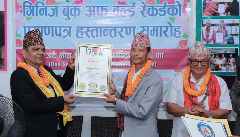 कीर्तिमानी गीतकार डा। डीआर उपाध्यायले ५० भाषामा एक गीत सार्वजनिक गरेर विश्व रेकर्ड बनाएका छन् । काठमाडौमा बुधबार साँझ आयोजित एक कार्यक्रममा उनलाई उक्त विश्व रेकर्ड ९गिनिज बुक अफ वर्ल्ड० प्रमाणपत्र सहरी विकास मन्त्री मेटमणी चौधरीले प्रदान गरे। मन्त्री चौधरीले डा। उपाध्यायलाई देशलाई अन्तर्राष्ट्रिय क्षेत्रमा चिनाउन गरेको योगदानको उचित सम्मान र कदर गर्नुपर्ने बताए ।…