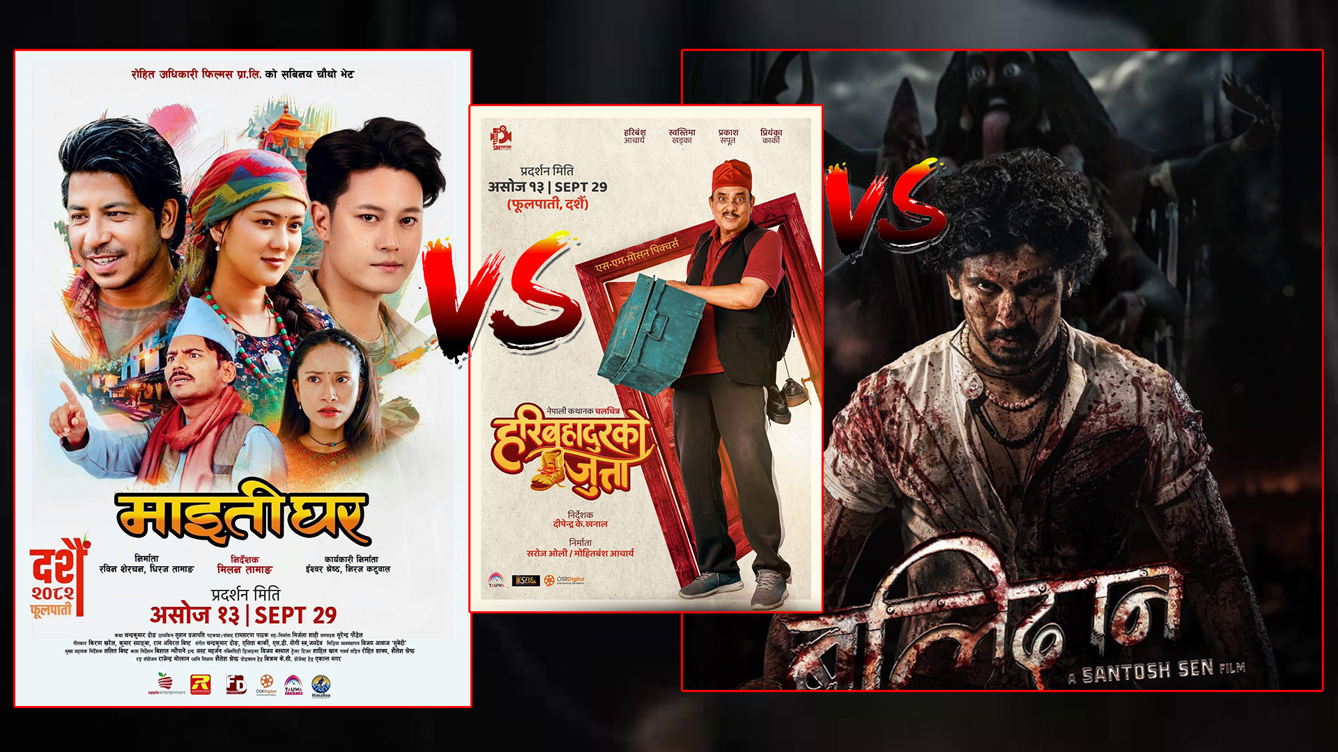 काठमाडौं - आगामी दशैंको फुलपातीमा तीन नेपाली चलचित्रको भिडन्त हुने भएको छ । गत वर्ष जस्तै यस वर्ष पनि तीन ठूला चलचित्रबीच भिडन्त हुने भएको हो । अघिल्लो दशैंमा ‘छक्का पञ्जा ५’, ‘१२ गाउँ’ र ‘ज्वाइँ साब’ प्रतिस्पर्धामा उत्रिएका थिए । जसमध्ये ‘छक्का पञ्जा ५’ र ‘१२ गाउँ’ ले बाजी मारे । दर्शकले दुवै चलचित्रलाई अत्यधिक…