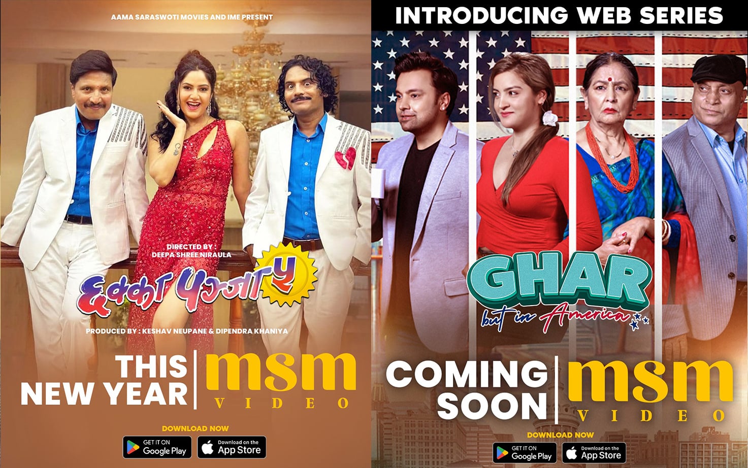 लोकप्रिय ओटीटी प्लेटफर्म एमएसएम एपमा नयाँ नयाँ नेपाली फिल्महरु सार्वजनिक भइरहेका छन् । नयाँ वर्षको दिनबाट फिल्म ‘छक्का पन्जा ५’ यो एपमा सार्वजनिक भइसकेको छ ।अब, आमाको मुख हेर्ने दिनबाट वेव सिरिज ‘घर बट इन अमेरिका’ पनि प्रशारण हुने भएको छ ।विमलेश अधिकारीको निर्देशनमा विमलेश र अरुणिमा लम्सालको मुख्य भूमिका रहेको यो वेव सिरिज १२…