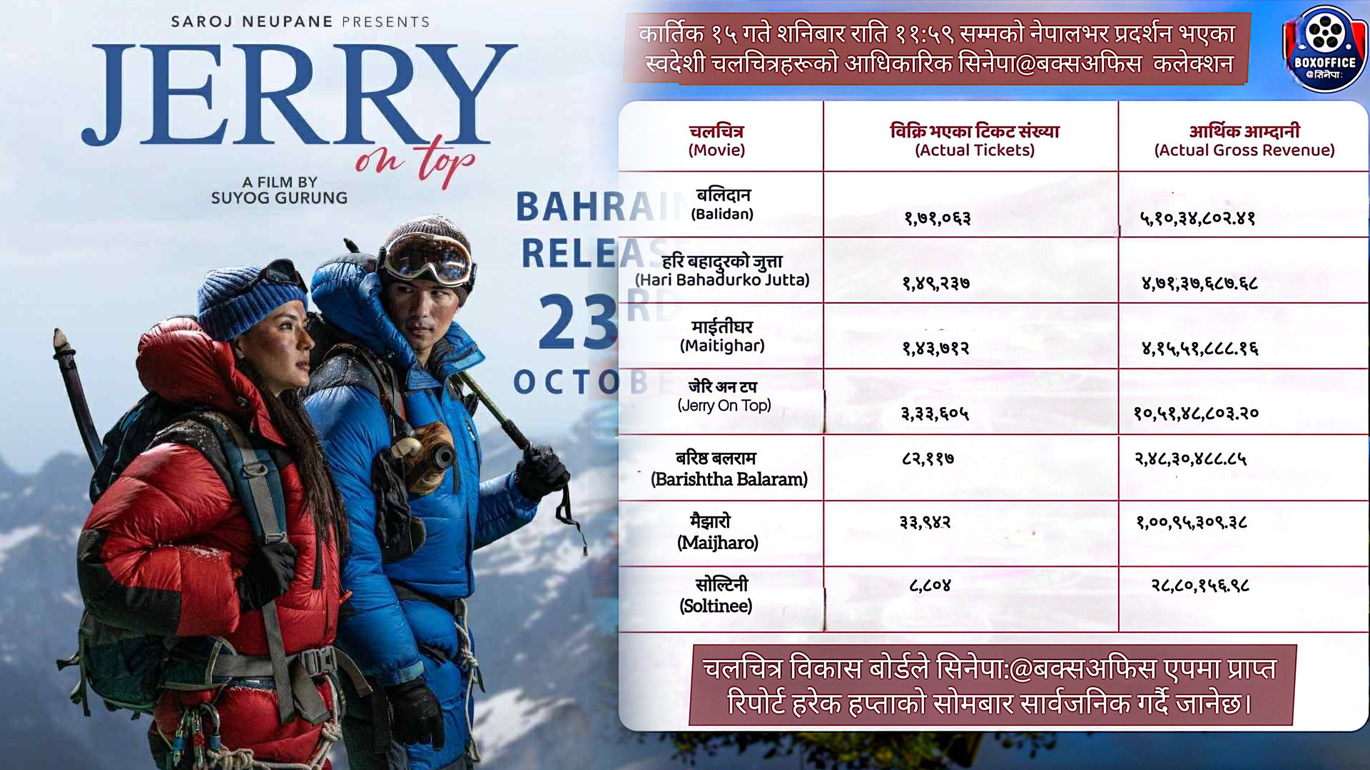 काठमाडौं । चलचित्र विकास बोर्डले दसैंयता प्रदर्शनमा आएका सात चलचित्रको व्यापारको विवरण सार्वजनिक गरेको छ । हरेक सोमबार बोर्डले बक्स अफिस रिपोर्ट प्रकाशन गर्ने गर्छ । जसअनुसार सोमबार प्रकाशित बक्स अफिस रिपोर्टमा अनमोल केसी स्टारर ‘जेरी अन टप’ अगाडि छ । दसैँको फुलपातीका दिन तीनवटा चलचित्र रिलिज भएका थिए । तीनवटै चलचित्रमा दर्शक बाँडिँदा कसैले…