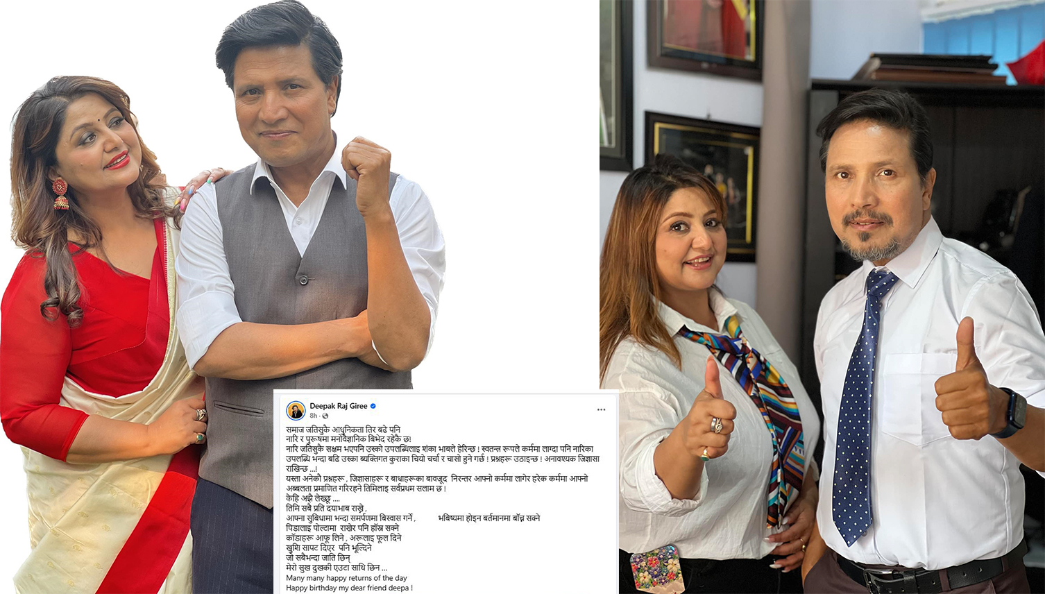 काठमाडौं – अभिनेत्री तथा निर्देशक दीपाश्री निरौला शनिबार आफ्नो जन्मदिन मनाउँदै छिन्। सामाजिक सञ्जालमा प्रशंसक तथा साथीहरूले उनलाई जन्मदिनको शुभकामना दिइरहेका छन्। दीपाश्रीको विशेष दिनमा उनका निकट मित्र दीपकराज गिरीले हरेक वर्षझैँ यसपटक पनि अर्थपूर्ण शुभकामना सन्देश लेखेका छन्। दीपालाई आफ्नो “सुख–दुःखकी साथी” भन्दै दीपकले भावुक शब्दमार्फत शुभकामना दिएका छन्। दीपकले लेखेका छन् :“समाज जतिसुकै…