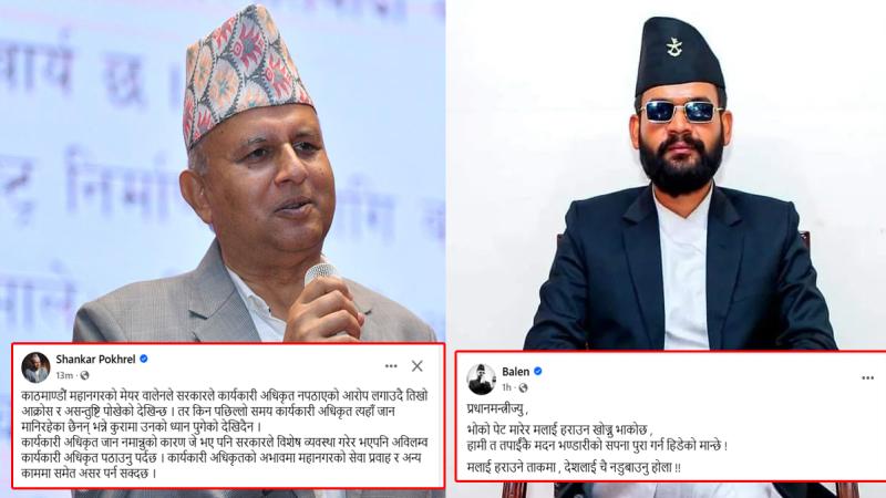 १७ फागुन, काठमाडौं । केपी शर्मा ओलीलाई लक्षित गर्दै काठमाडौं महानगरपालिकाका मेयर बालेन शाहले असन्तुष्टि जनाएको केहीबेरमै एमाले महासचिव शंकर पोखरेलले काउन्टर प्रतिक्रिया जनाएका छन् । बालेनको नेतृत्वमा रहेको काठमाडौं महानगरपालिकामा किन कार्यकारी अधिकृत जान चाहँदैनन् भन्ने कुरामा उनको ध्यान नगएको भन्दै पोखरेलले प्रश्न उठाएका छन् ।प्रधानमन्त्री केपी शर्मा ओलीलाई सम्बोधन गर्दै बालेनले सामाजिक सञ्जालमा…