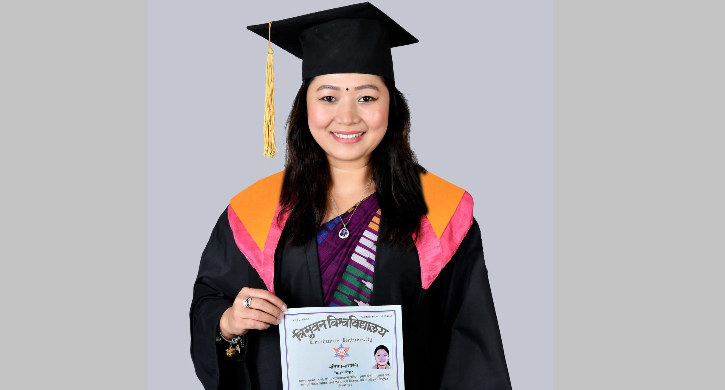 काठमाडौँ- गायिका मिलन नेवारले त्रिभुवन विश्वविद्यालयअन्तर्गत ललितकला शास्त्री (स्नातक) उत्तीर्ण गरेकी छिन्। आफ्नो शैक्षिक उपलब्धिको बारेमा उनले सामाजिक सञ्जालमार्फत जानकारी दिएकी हुन्। मिलनले फेसबुकमा लेखेकी छिन्-त्रिभुवन विश्वविद्यालय अन्तर्गत ललितकला शास्त्रीको परीक्षामा उत्तीर्ण भइ स्नातकोपाधिको प्रमाणपत्र सहित विभूषित हुन पाउँदा अत्यन्त गर्वको महसुस भएको छ। विश्वविद्यालय परिवार, सम्पूर्ण गुरुबुवा, गुरुआमा र साथीभाइहरू प्रति हार्दिक आभार व्यक्त…