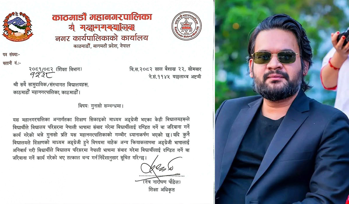 काठमाडौं - काठमाडौँ महानगरपालिकाले नेपाली भाषामा संवाद गर्न दिन मातहतका सामुदायिक तथा संस्थागत विद्यालयलाई निर्देशन दिएको छ । उसले विद्यालयमा नेपाली बोल्दैमा विद्यार्थीलाई कारबाही नगर्न सचेतसमेत गराएको छ । महानगरपालिकाको शिक्षा विभागले सोमबार सबै सामुदायिक तथा संस्थागत विद्यालयलाई पठाएको पत्रमा शिक्षणको माध्यम अंग्रेजी हुने विषयमा बाहेक अन्य क्रियाकलापमा अङ्ग्रेजी भाषालाई अनिवार्य नगर्न निर्देशन दिएको हो…