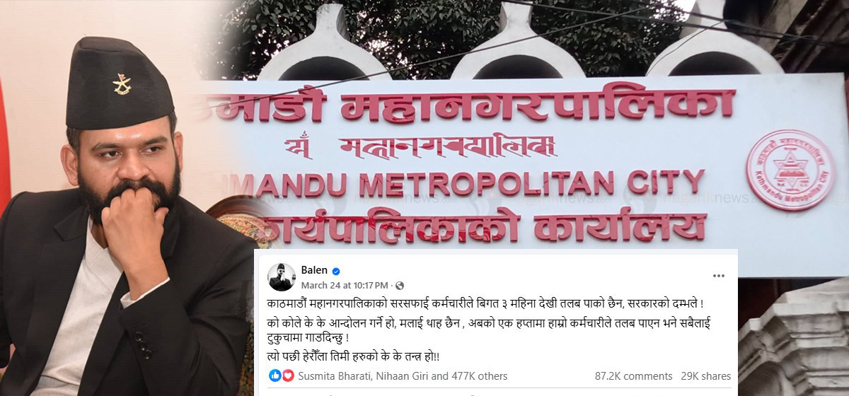 काठमाडौं - ‘अर्कालाई खनेको खाल्डोमा पहिले आफैं परिन्छ’ भन्ने नेपाली उखान चर्चित छ । अहिले यही उखान काठमाडौं महानगर प्रमुख बालेन्द्र साह बालेनको हकमा लागू भएको छ । गत चैत ११ गते बालेनले सामाजिक सञ्जाल फेसबुकमा लेखेका थिए, ‘काठमाडौं महानगरपालिकाको सरसफाइ कर्मचारीले विगत तीन महिनादेखि तलब पाको छैन, सरकारको दम्भले ! को कोले के के…
