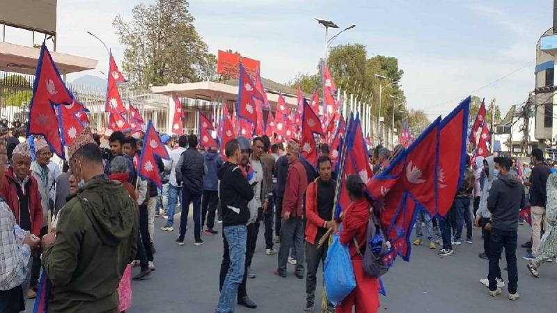 काठमाडौं । पूर्वराजा ज्ञानेन्द्र शाहलाई तेस्रोपल्ट राजा बनाउने उद्देश्यका साथ आन्दोलनरत राजावादीले नारायणहिटी दरबार संग्राहलय अगाडि प्रदर्शन गरेका छन । शाही युवा शक्ति नेपाल नामक संगठनको अगुवाईमा राजावादीहरूले आज दिउँसो नारायणहिटी अगाडि प्रदर्शन गरेका हुन । ‘ज्ञानेन्द्र सरकारलाई तेस्रो पटक राजा घोषणा गरौँ । राजा जनता एक हौँ’ लेखिएको ब्यानर र राष्ट्रिय झण्डासहित आएको समूहले नारायणहिटीको…
