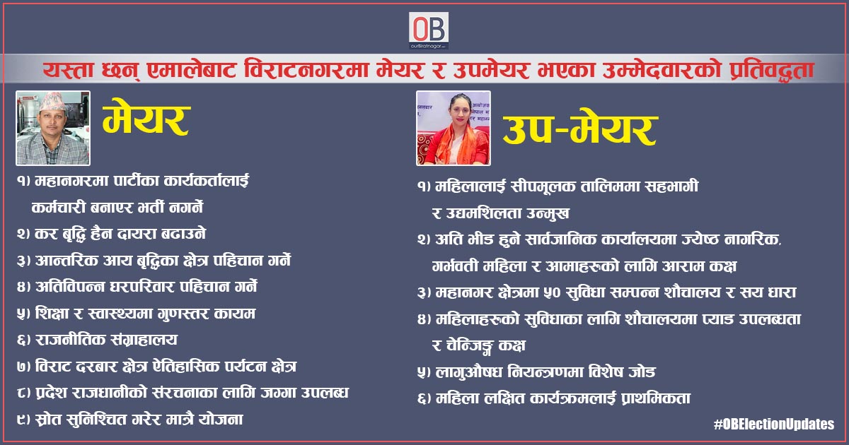 आगामी बैशाख ३० गते हुने निर्वाचनमा नेकपा एमालेकातर्फबाट विराटनगरमा मेयर र उपमेयरका उमेदवारले महानगरपालिकालाई पार्टी कार्यकर्ताको भर्ती केन्द्र नबनाउने प्रतिवद्धता जाहेर गरेका छन् । विराटनगरमा पत्रकारसँग आफ्ना एजेण्डा प्रस्तुत गर्दै मेयरका उमेदवार सागर थापाले आन्तरिक आयले थेग्नै नसक्ने गरि कार्यकर्तालाई महानगरको कर्मचारी नबनाउने प्रतिवद्धता व्यक्त गर्नु भएको हो । प्रदेश १ को एक मात्रै महानगर…