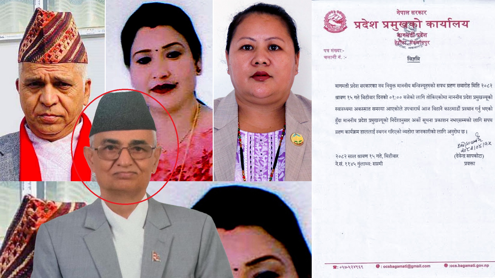 काठमाडौं - बागमती प्रदेश प्रमुख दीपकप्रकाश देवकोटा अचानक अस्वस्थ भएपछि बिहीबारका लागि तय तीन मन्त्रीको सपथ कार्यक्रम रोकिएको छ । बागमती प्रदेशका मुख्यमन्त्री बहादुरसिंह लामाले नवनियुक्त तीन मन्त्रीको सपथ गर्न समय मिलाउन भनेपछि प्रदेश प्रमुख कार्यालयले बिहीबार दिउँसो १ बजेका लागि समय तोकेका थिए । तर बागमती प्रदेशमा कांग्रेसभित्रको आन्तरिक किचलोका कारण प्रदेश प्रमुख देवकोटाले…