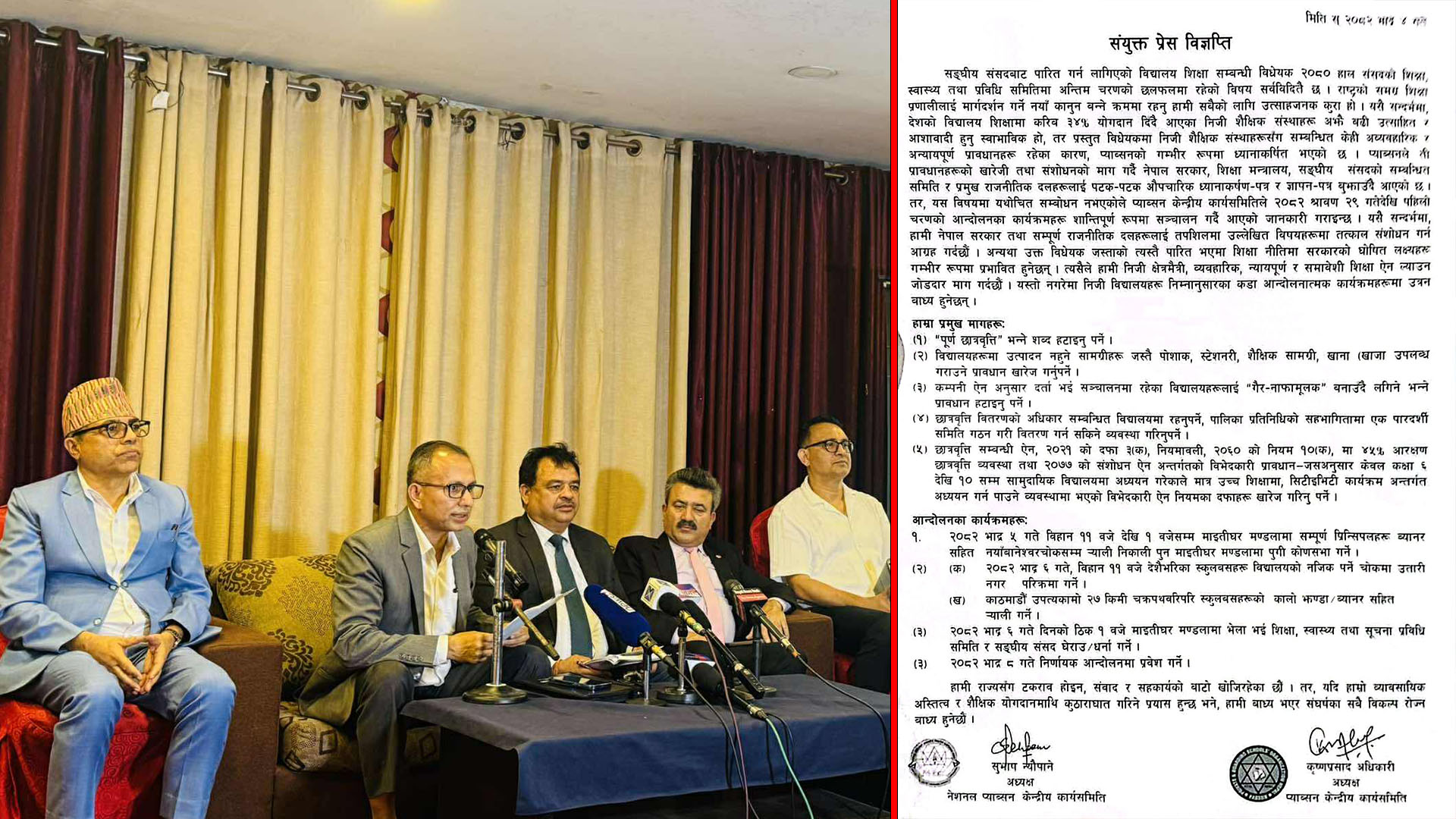 काठमाडौं । विद्यालय शिक्षा विधेयकमा समेटिएका विषय हटाउनुपर्ने माग राख्दै नेसनल प्याब्सन र प्याब्सनले आन्दोलनको घोषणा गरेका छन् । बुधबार काठमाडौंमा पत्रकार सम्मेलन गरी प्याब्सन र एनप्याब्सनले विरोधका कार्यक्रम घोषणा गरेका हुन् ।हाल छलफलमा रहेको शिक्षा विधेयकमा रहेका केही प्रावधान संशोधन नभए भदौ ८ देखि निर्णायक आन्दोलन थाल्ने चेतावनी पनि दिइएको छ । ‘हामी राज्यसँग…